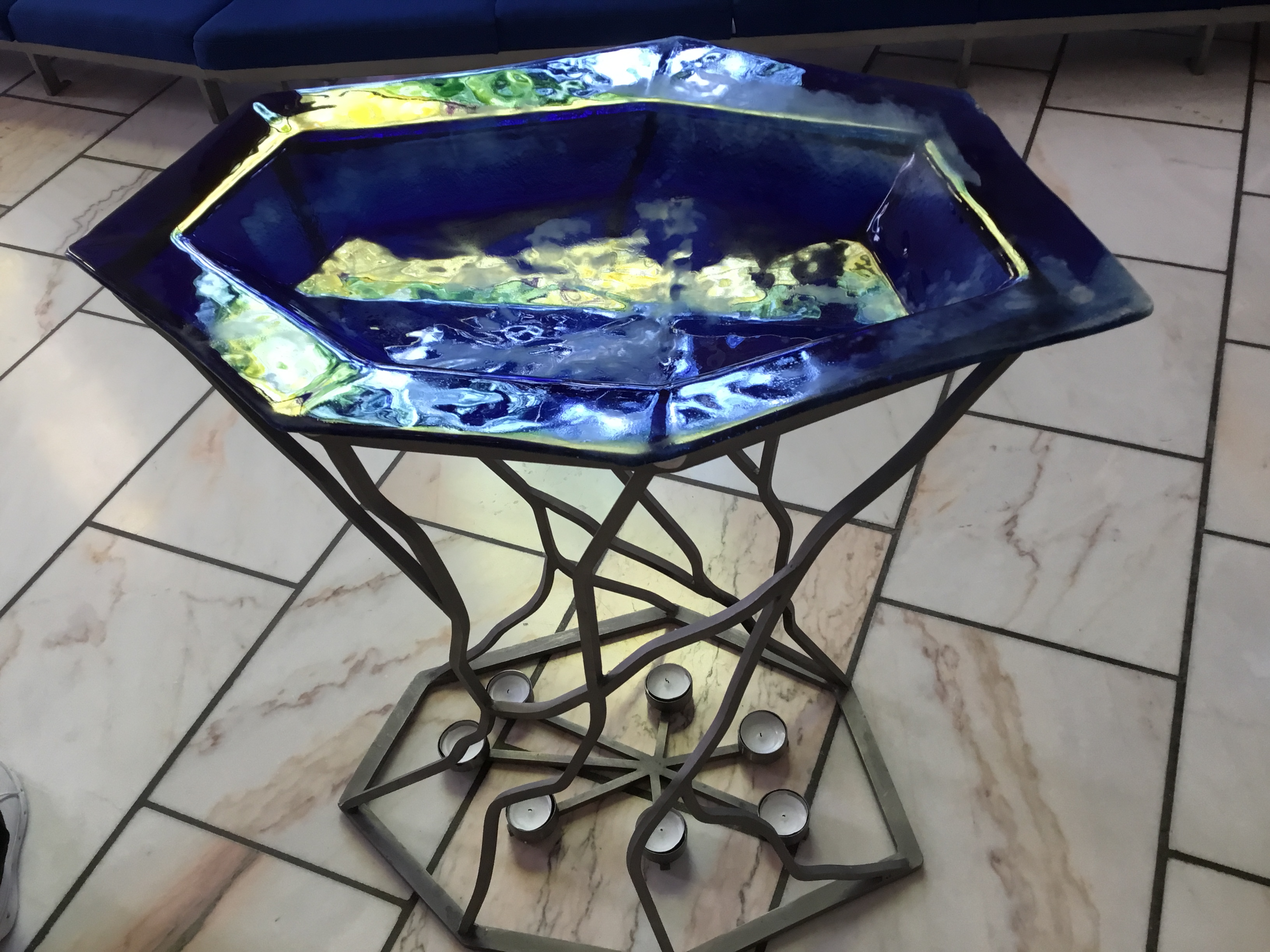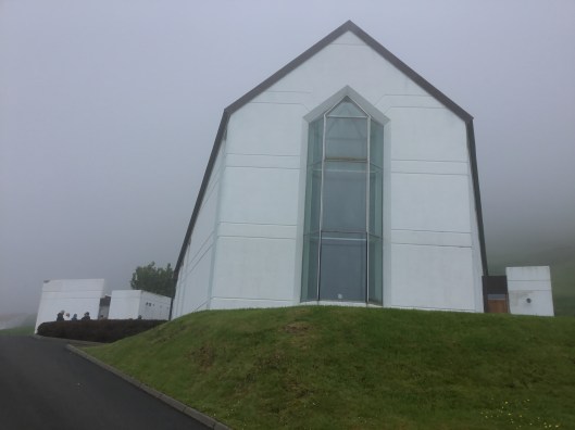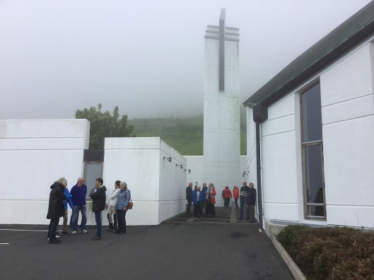 Dopfunten har även den sju kanter med samma hänsyftning förstås. Allt är gjort i samma färgskala en väldigt vacker blå färg som skiftar i ljust såväl som i svart. Naturligtvis smakar det så kostar det och efter ett tag gick det hela i konkurs innan kyrkan var klar. Men man ville ha den här kyrkan och byborna med fler personer beslöt att tillsammans ordna aktiviteter så att man fick in den summa som fattades. Bland annat ordnades det Bingo. Som tack för det låter kyrkklockan med ett ovanligt ljud. Det låter, Bin go, Bin go. Fast det är nog inte riktigt sant men med lite fantasi så. Ett mycket givande kyrkobesök var det i alla fall i synnerhet som guiden sjöng en psalm på färöiska men den inspelningen blir privat.