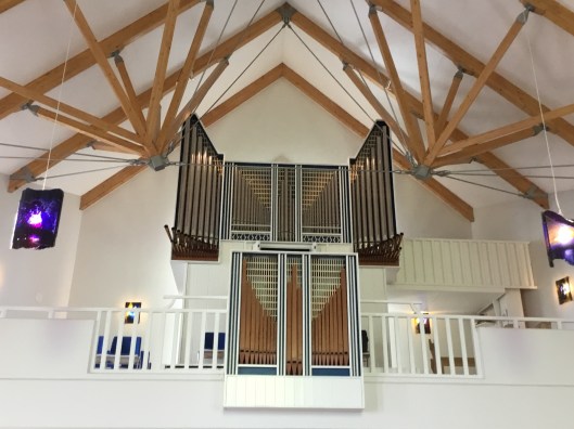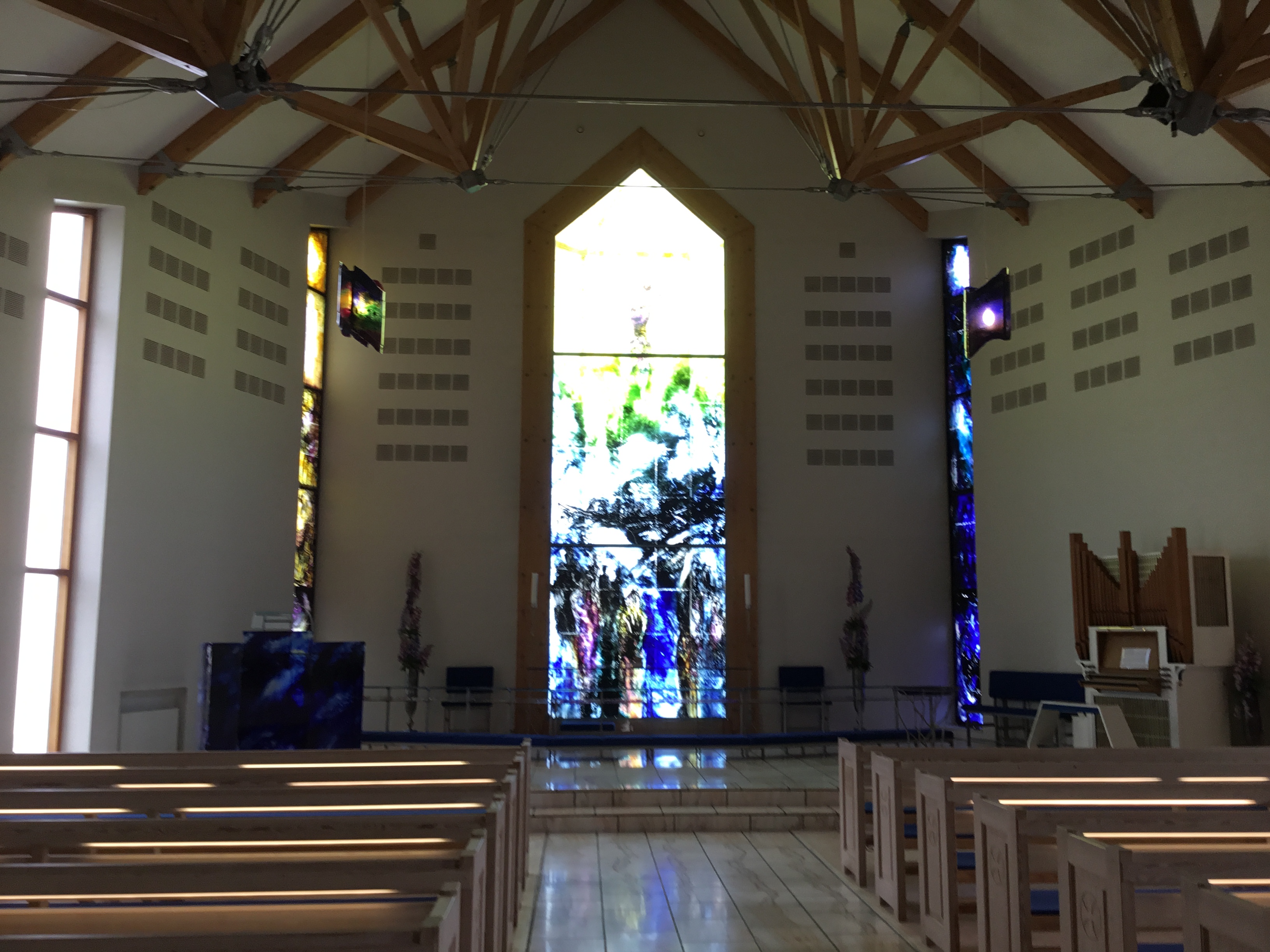 En mycket unik takkonstruktion för vilken man har vunnit ett pris. På denna bilden ser man även orgeln vars historia är lite rolig. Den har nämligen från början varit i en kyrka i Ängelholm i Sverige. Därefter flyttades den till en kyrka i Köpenhamn men efter att den kyrkan skulle läggas ner blev orgeln förflyttad hit.
