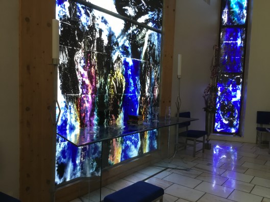 Den stora altartavlan målad på glas skall avspegla världen vi lever i. Nederst på tavlan är det människor som står och tittar efter en båt. Överst på tavlan är det Jesu korsfästelse samt uppståndelsen på påskdagen. Kyrkan är stor och rymmer 270 sittplatser.