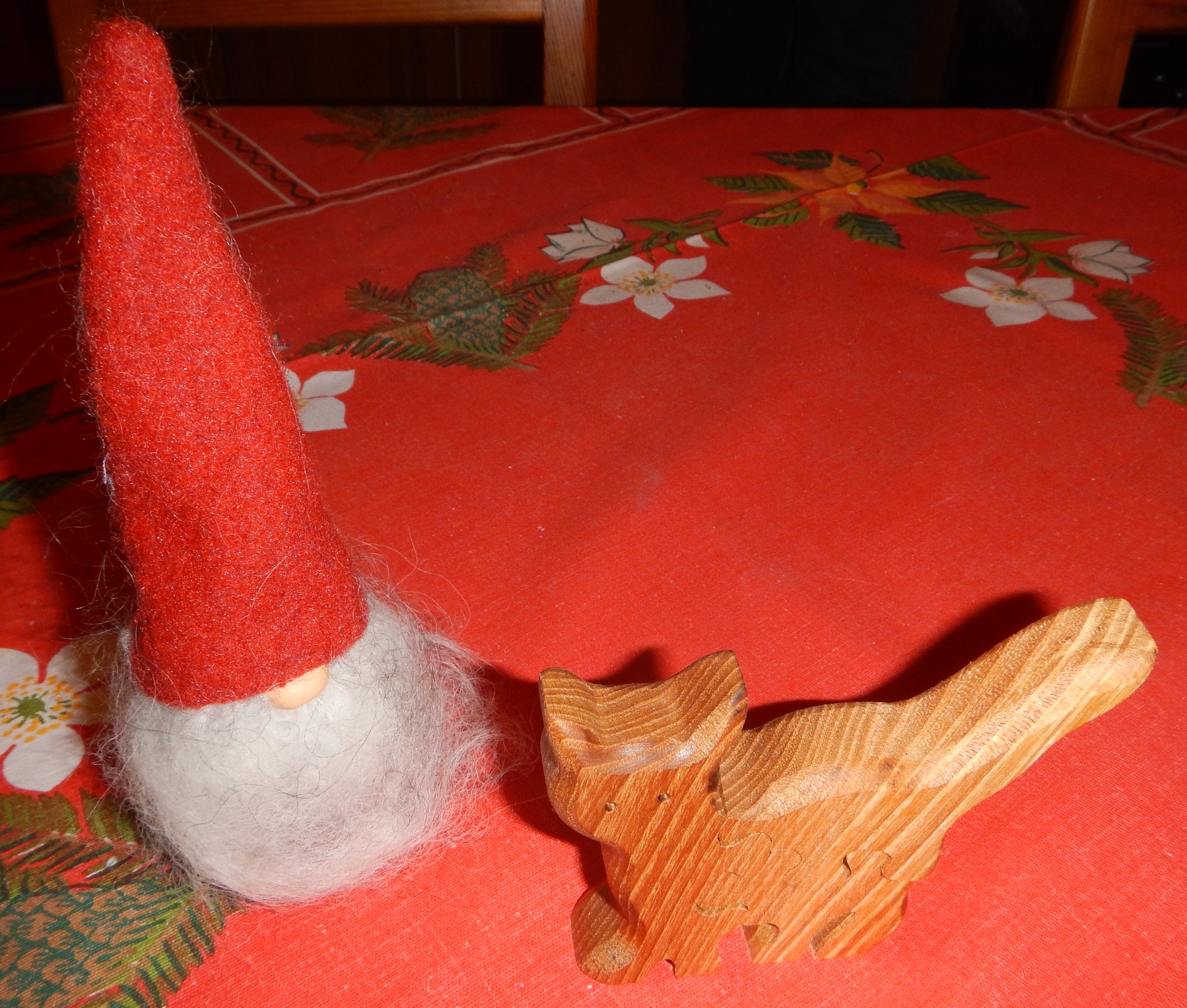 Även om december månad var lite deprimerande av och till så finns det ju alltid små glädjeämnen. Som när grannen tittar in på julaftons förmiddag och överlämnar en liten hustomte med tillhörande katt, får man trist kan man dela och pussla ihop katten. Men det är tre bitar så det kräver en viss intelligens. Både katt o tomte tillhör mina favoritsaker.