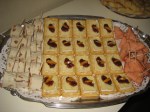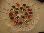 Enkelt men gott, smördegssnuror från tidigare recept den 2 mars, kex (Saltiner) med vitmögelost, fikonbalsamico samt en klick fikonmarmelad, och ytterligare samma kextyp med rökt lax, romsås, citronbit och dill. Till detta serverades mousserande jordgubbsvin med en fryst jordgubbe som fick agera isbit.