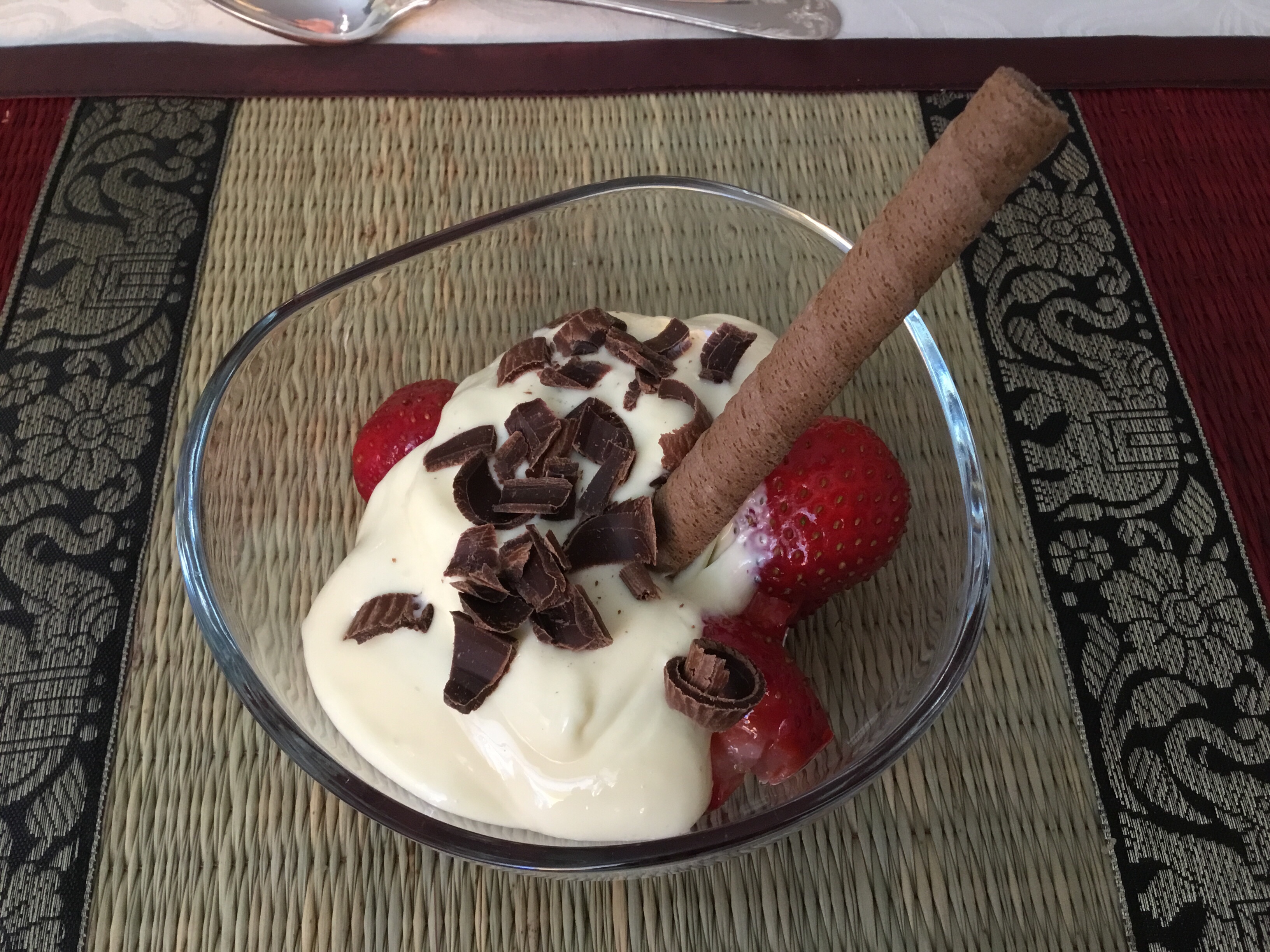 Naturligtvis blev det färska jordgubbar med marscaponekräm att avsluta det hela med. Nu har ni fått ett bra tips till en festlig sommarmiddag.Gissa om vi var tvärmätta i flera dagar efteråt.