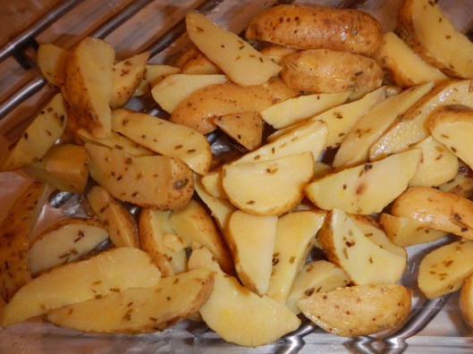 Ta små potatis, dela dem i klyftor som inte är för stora, koka i lättsaltat vatten så att de lite mjuka men bara ytterst. Därefter låt dem kallna lägg dem i en bunke eller plastpåse och blanda med matolja och dina favoritkryddor men snåla inte. När det sedan är dags att äta lägg dem i en långpanna (ha gärna bakplåtspapper i botten) strö över lite flingsalt. Cirka 20 minuter i 200 graders värme. De ska ha fått en fin färg. Eftersom jag inte ville göra både efterrätt och kaka till kaffet blev det en mycket enkel kompromiss dock godkänd av det tioåriga barnbarnet. Eftersom det inte går att spritsa vaniljvip så avstod jag från att garnera kanterna. Det blir naturligtvis vackrare men något, bär, vinbärsblad eller vad man hat tillstädes.