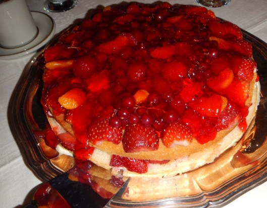 Lite av Kajsa Vargs ”Man tager vad man haver”. Ett paket färdig sockerkaksbotten, på de två understa bottnarna brer jag över jordgubbssylt och Mildas vaniljvisp 14%. Därefter på med översta botten. Där lägger jag på bär som så här års är prisvärda, det blev färska jordgubbar, hallon, vinbär samt en burk mandarinklyftor. I god tid förberedde jag ett paket Jello som när det blev halvstelt skedades över bären. Denna enkla tårta serverar jag med 14% Vaniljvisp, på så vis blir det en ganska mager, saftig och inte så söt variant av tårta. Tänk på att vissa bär gör så att gelé inte stelnar som Kivi exempel.