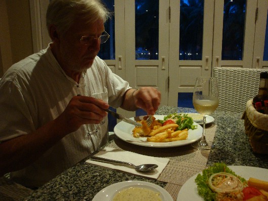 Vi valde att gå en trappa ner från restaurangen för att sätta oss vid ett bord som var placerat i sanden. Härligt att höra vågskvalpet.