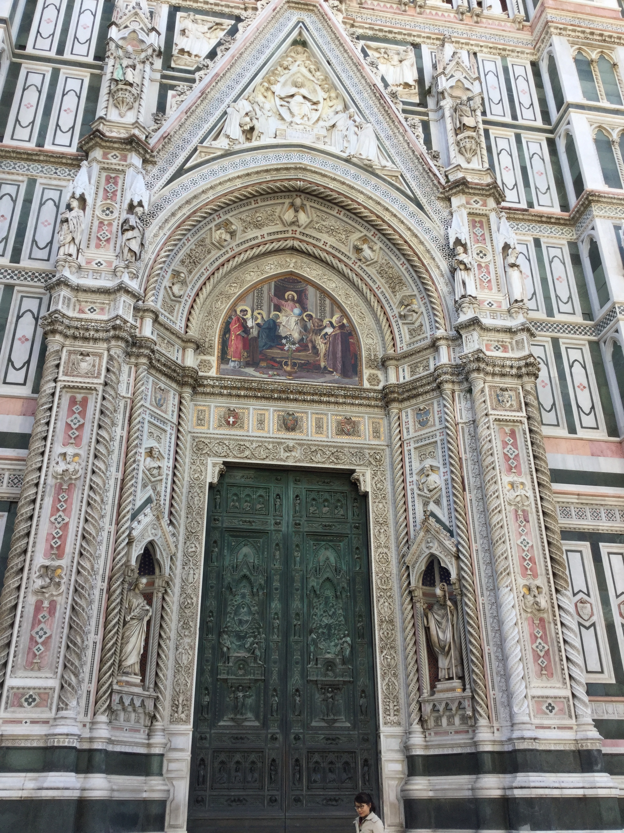 Detta är en stor turistattraktion och vill man se kyrkan invändigt bör man boka biljett några dagar i förväg. Vi såg den enbart från utsidan, ja det är fel att säga såg för vi skummade över den med snabba blickar. Det finns så många konstverk, målningar, skulpturer så det är helt omöjligt att tillgodogöra sig allt. Nedan ett foto av en av dörrarna, där kan man föreställa sig hur vacker kyrkan är som är helt täckt av liknande konst.