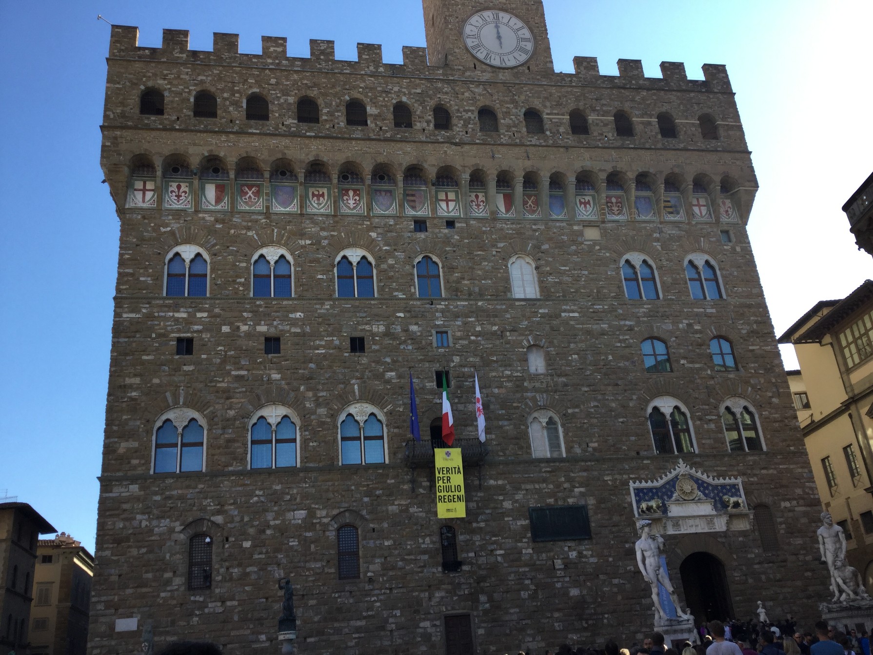 Inte långt från Katedralen ligger det L-formade torget Piazza della Signorina, vid ena sidan av torget finns några vackra statyer jag tror att de var verk av Michellangelo? ? Ett hus som ligger där är i alla fall Palazzo Vecchio (Old Palace) i dag är det stadens rådhus.