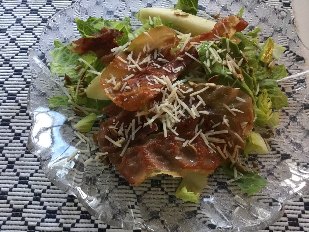 Det blev en lätt middag då tiden gick så fort. En sallad bestående av, romansallad ( man kan ha vilken som helst, ruccola är gott) skivat päron, skivad avocado, rostade solrosfrön, tre skivor hårdstekt lufttorkad skinka, olivolja,salladskryddor och riven parmesan.