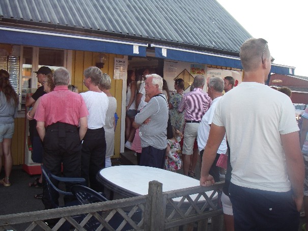 Idag satt jag på en parkbänk och ”tjuvlyssnade” på några äldre damer, när jag hört tillräckligt reste vi oss och åkte tillbaka till vår tillfälliga boplats. Vi gjorde dock ett stopp på vägen för att inhandla något ätbart, valet föll på en räkbakelse med sallad. Vad annars när man befinner sig på västkusten dessutom var räkorna handskalade enligt skylten som stod bredvid dem. Eftersom vi lyckats få upp förtältet till husvagnen var det naturligt att de skulle inmundigas där.