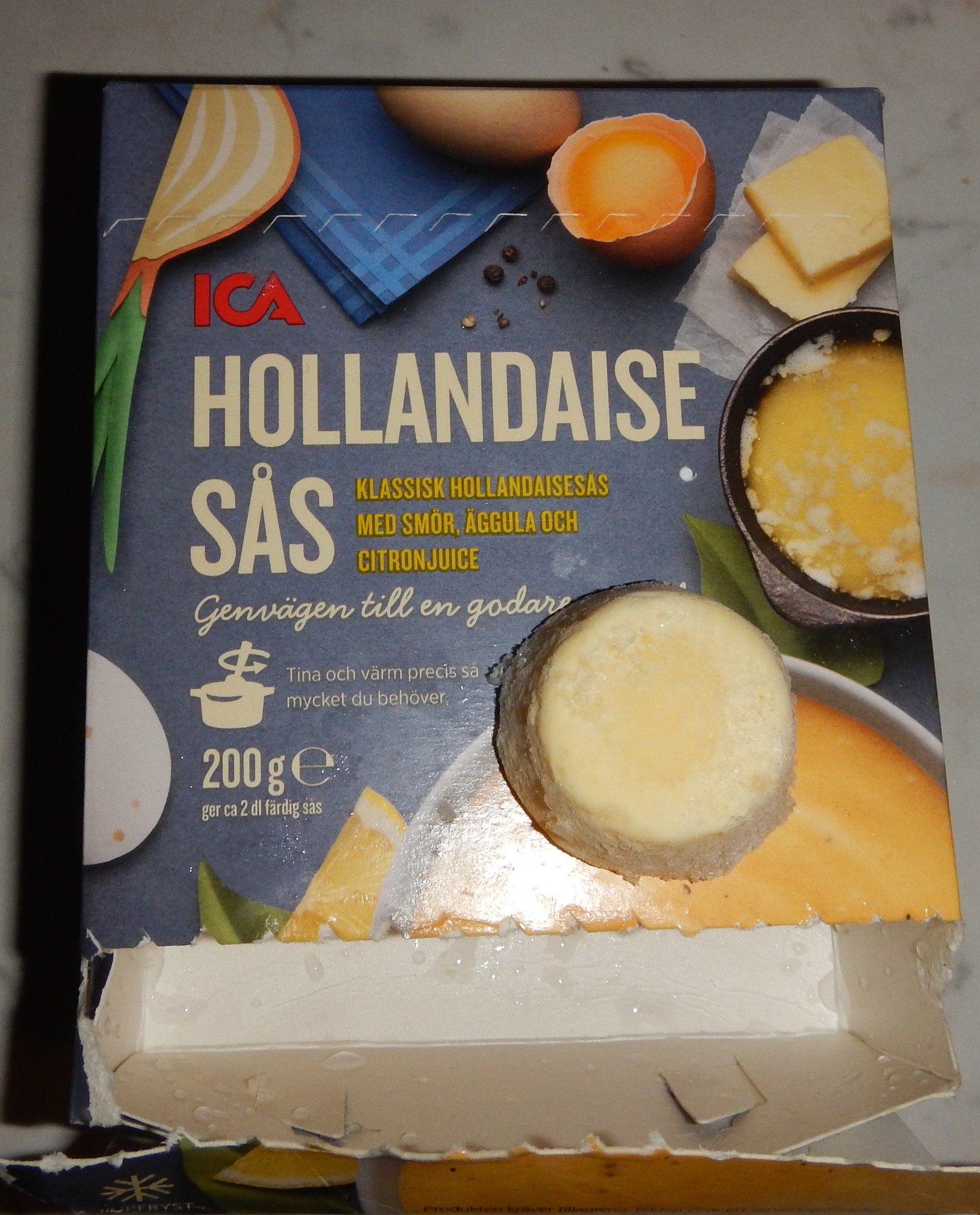 Såsen var väldigt god och så enkel att göra. Den ligger som små vita puckar (se bilden) i kartongen och man tar så många man behöver och värmer. Gott, enkelt och inget spill.