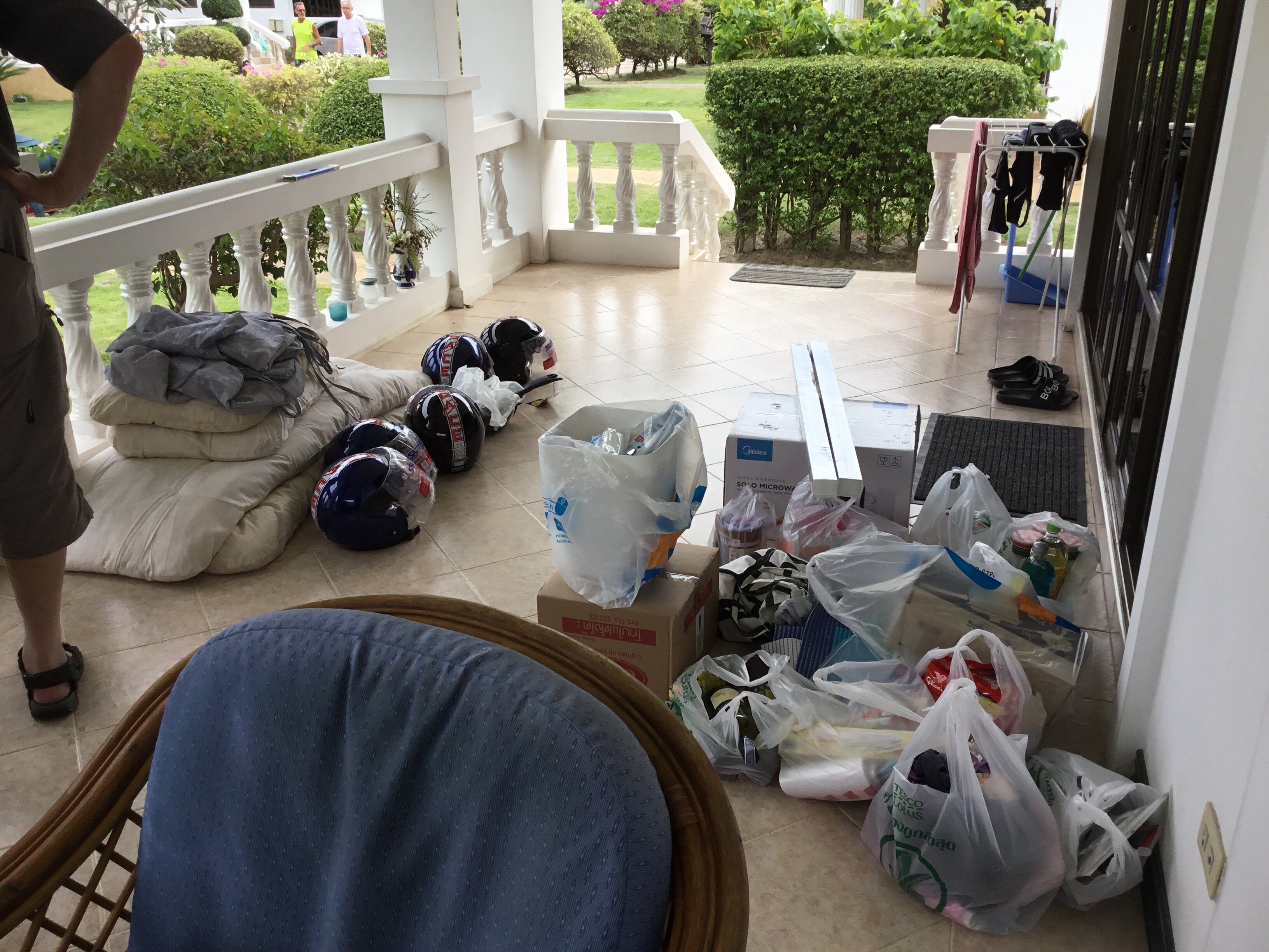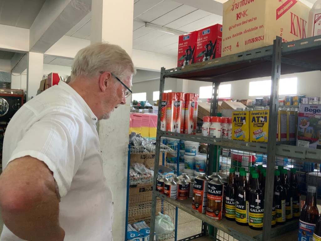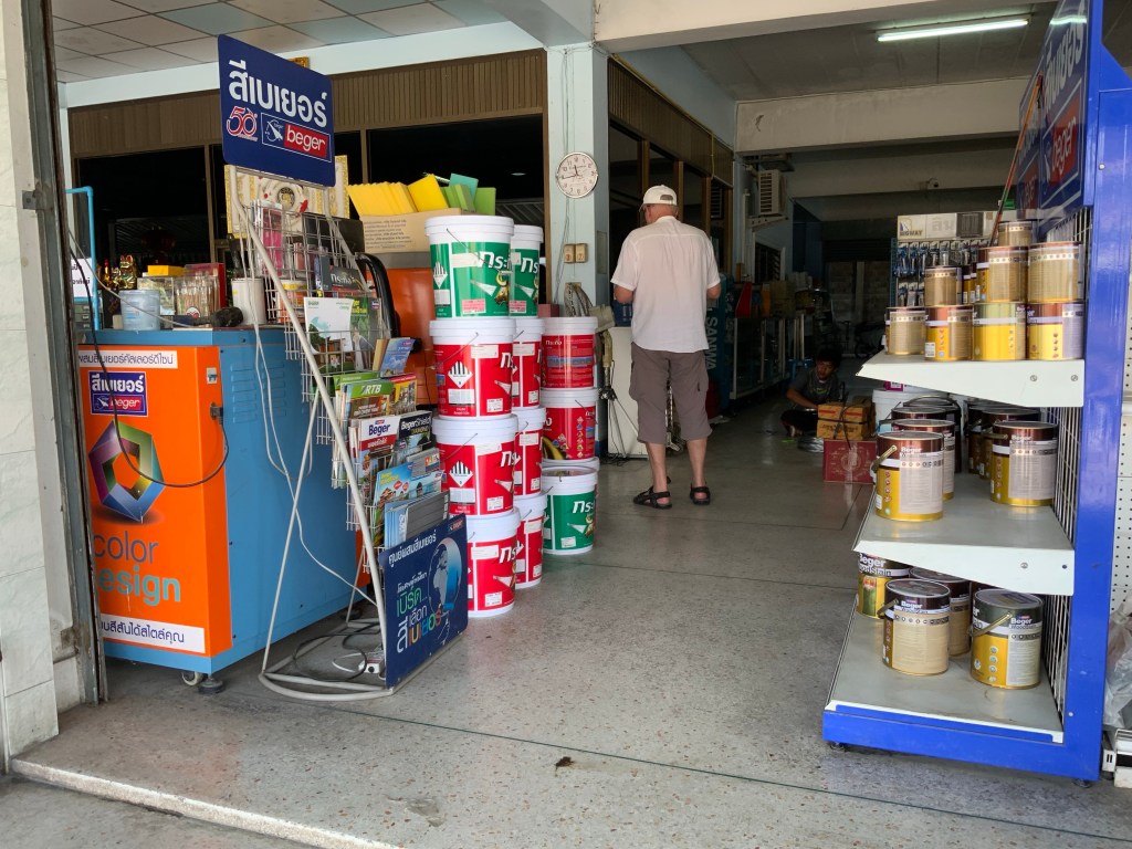 Om man behöver målarfärg och det visar sig att den man har inte räcker, ja då får man köpa till. Vi visste att det fanns på Home Pro i Prachuap så det blev en bilresa dit. Det tar cirka en timme fram och tillbaka från Huay Yang till Prachuap. Vi köpte en burk på 3,5 liter för drygt 500 THB. Nu var Rolf nöjd.