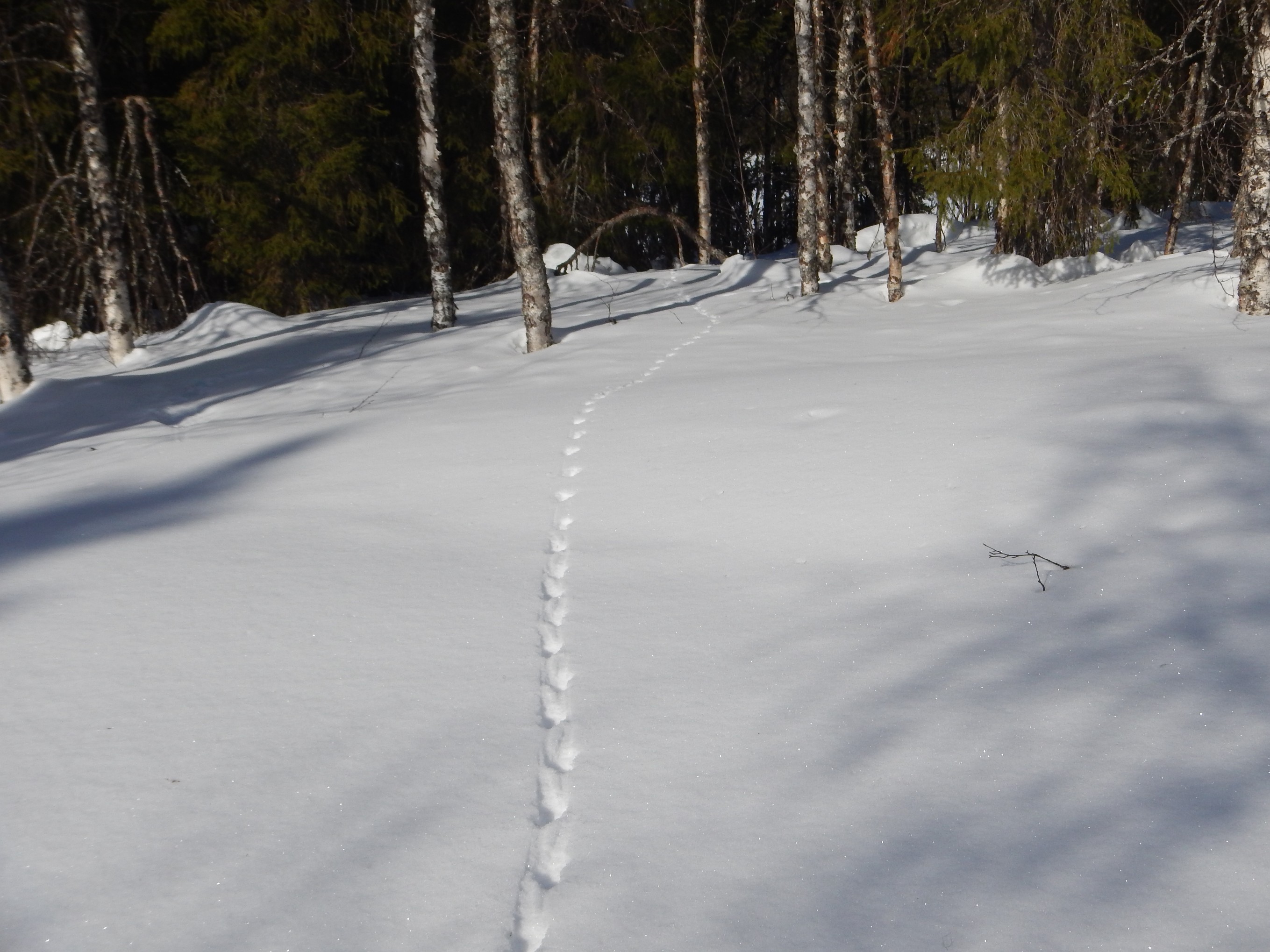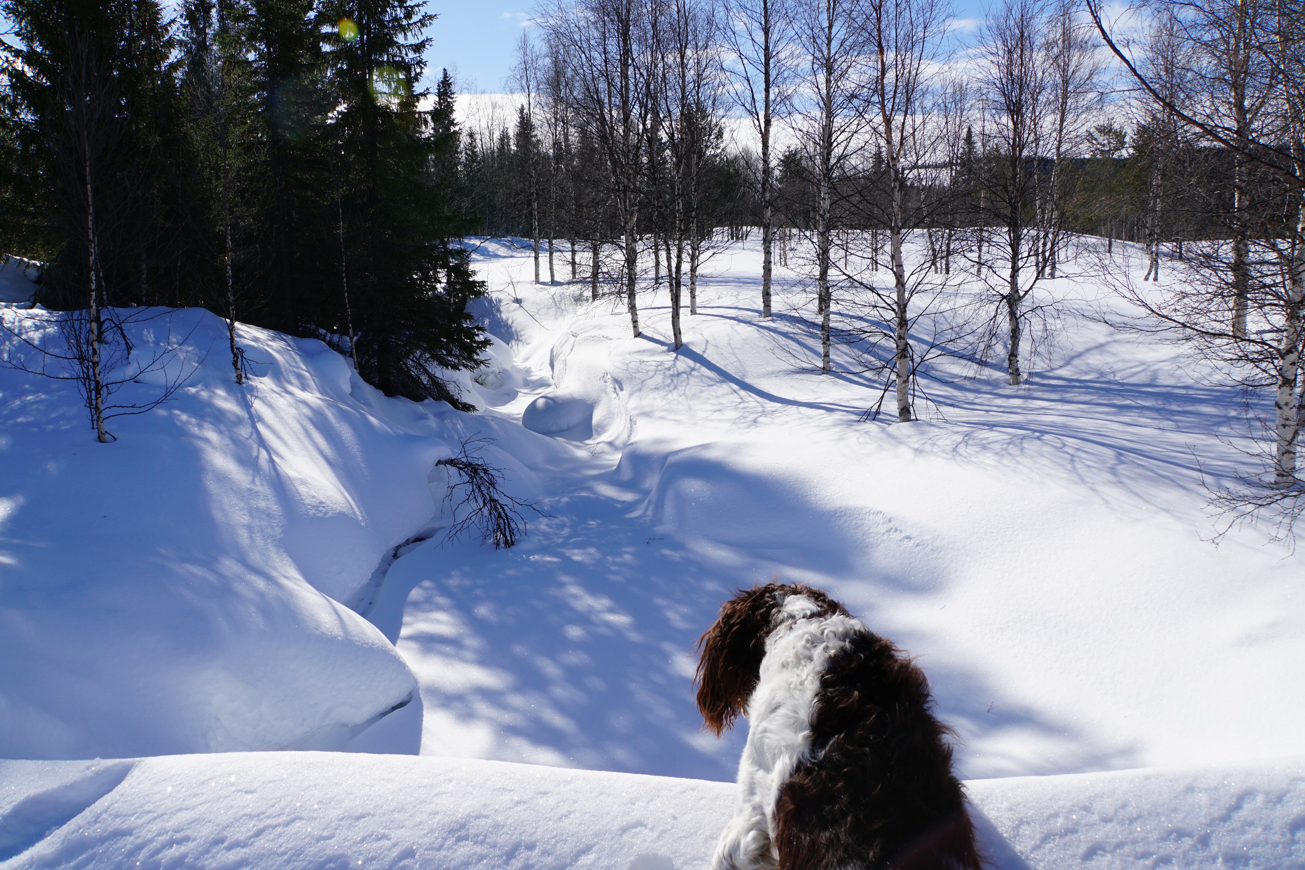 Men även om man inte ser eller hör några djur så finns dom där. Dessutom kan jag se hur hunden nosar lite extra ibland känner väl doften av ett jaktbyte. Rolf är ute så jag har ingen att fråga, får väl erkänna min okunskap när det gäller spår. Så mycket kan jag säga att de är efter ett djur men vilket?
