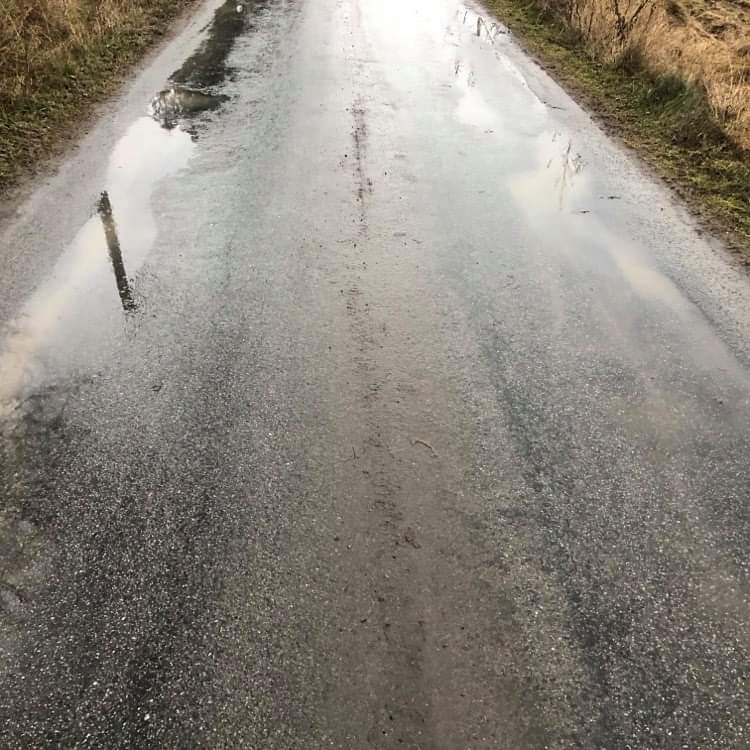 Den krassa verkligheten såg ut så här, lerig, blöt hund som måste duschas vilket betyder att man själv får göra detsamma. Hänga upp kläder till tork och tvätta leriga stövlar. Torka hallgolvet efter smutsiga tassar. Brygga lite kaffe för att pigga upp sig och titta ut på naturen och konstatera att regnet det bara öser ner och jag är så blöt om både skor och strumpor….. Enligt almanackan ska månadens sångtext vara Allting är vitt vitt vitt.