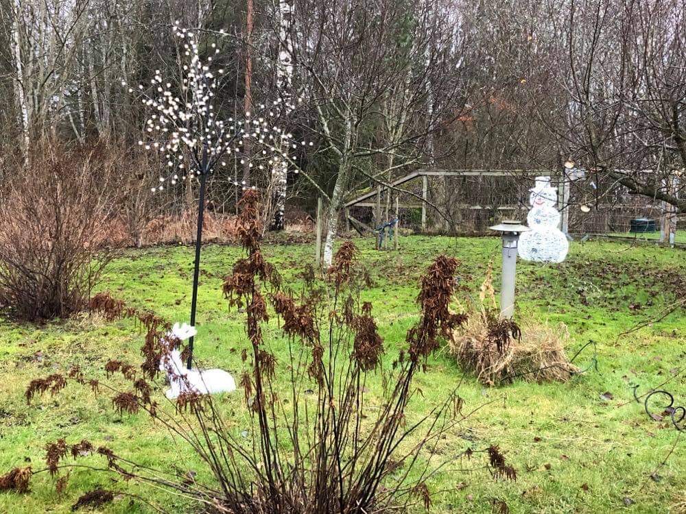 Eftersom vi bor lite ute på landet har vi nära till naturen vilket inte hjälper oss så mycket just nu, för några formationer av snön syns inte till. Grannens julprydnader försöker förgäves hjälpa till att lysa upp vår tillvaro.