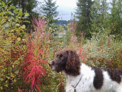 Ändå var jag helt överraskad när hunden kastade sig åt sidan och ställde sig på två ben samtidigt som han ylade. Hade jag inte fått informationen innan hade jag nog både släppt kopplet och sprungit hem. Bara ett par meter ifrån mig vid dikeskanten hoppade ett vackert, smäckert rådjur inte undra på att Bachus blev till sig. Helt frustrerad tittade han på mig, vad gäller egentligen? När jag går med husse skall jag kasta mig fram och driva rådjuret mot honom och när jag går med matte skall jag se ut som att jag är helt ointresserad. Inte lätt att pendla mellan jakthund och ”gosehund”. Och matte får stå ut, snart kommer snön och då blir det betydligt ljusare ute.