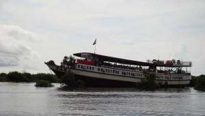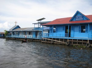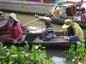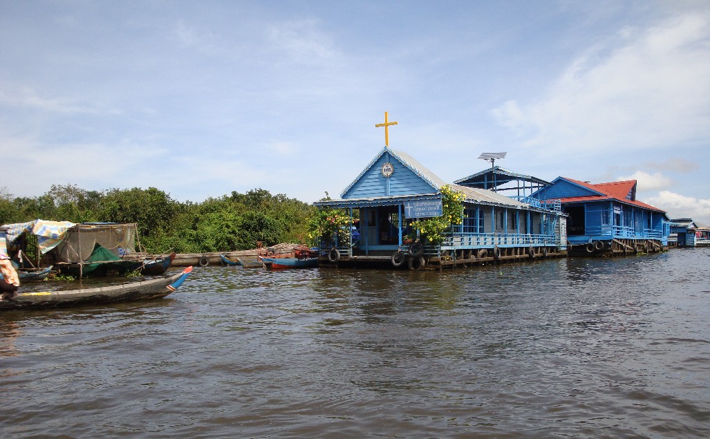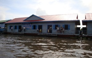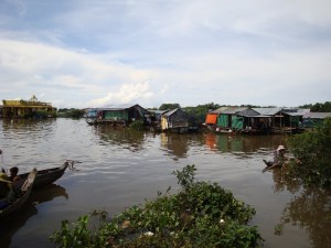 Översvämningarna i byn vid Lake Tonle Sap, där man bygger små gångar av brädor för att kunna ta sig till sina hus. Tvätten som hänger på tork är nog inte tvättad i det renaste vatten.