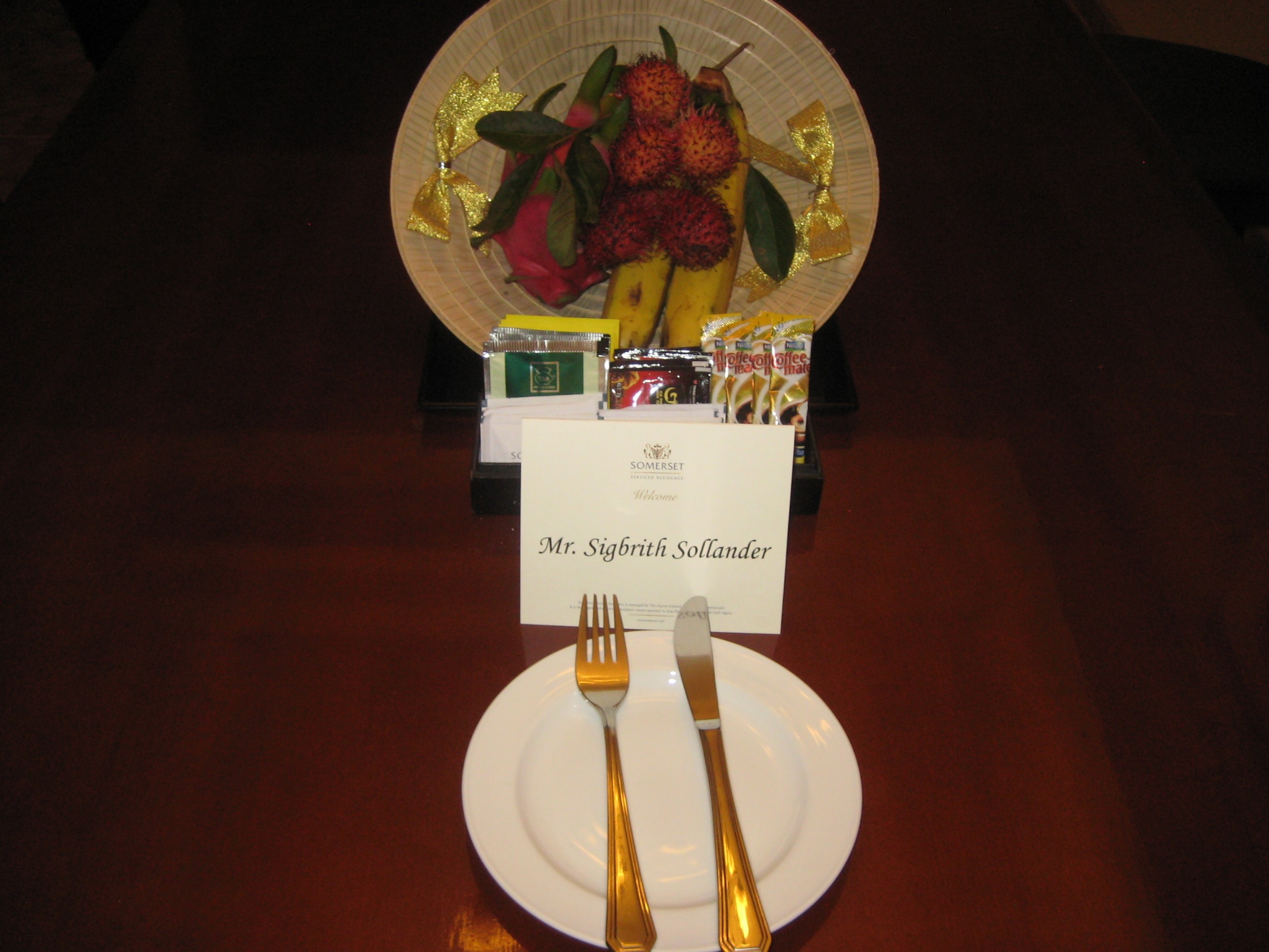 En annan liten detalj som jag kommer att minnas, är det fina välkomnandet på hotellet. Vackert uppdukat med frukt, olika tesorter och ett fint välkomstkort mötte mig på hotellrummet. Att det sedan borde stått Mrs i stället för Mr får man bortse ifrån.