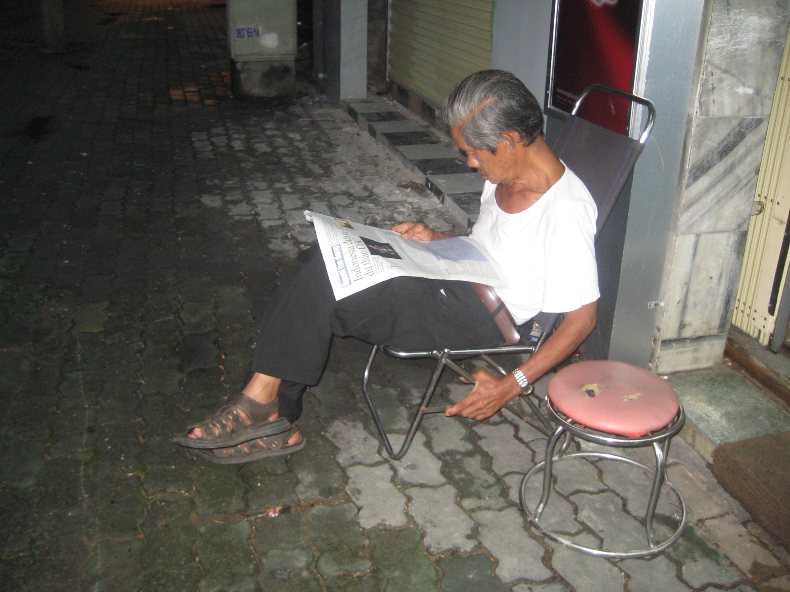Utelivet på kvällarna, som är av skiftande natur är ändå det som jag mest tänker på. Här tar man en stol och sätter sig på gatan, läser en tidning och njuter av kvällsbrisen. Den här mannen behärskar konsten att ta vara på ögonblicket. Med denna bild avslutas vår lilla resa i Vietnam. I morgon landar vi i Bangkok igen, för tredje gången under denna resa.