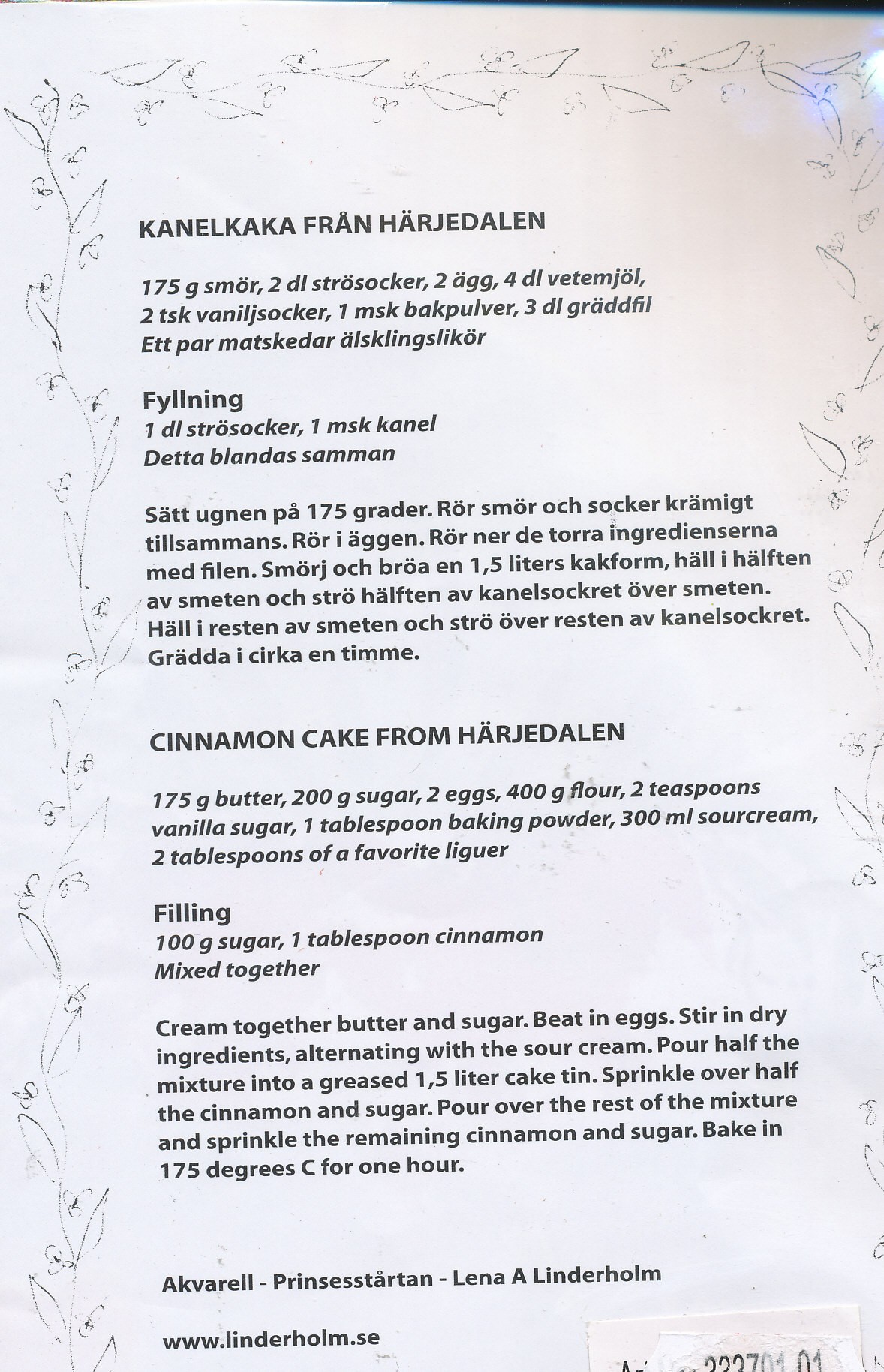 Det visade sig att det på baksidan finns ett recept tryckt på såväl svenska som på engelska. I det här fallet är det recept på en kanelkaka från Härjedalen, i morgondagens blogg kan jag tala om hur den blev.