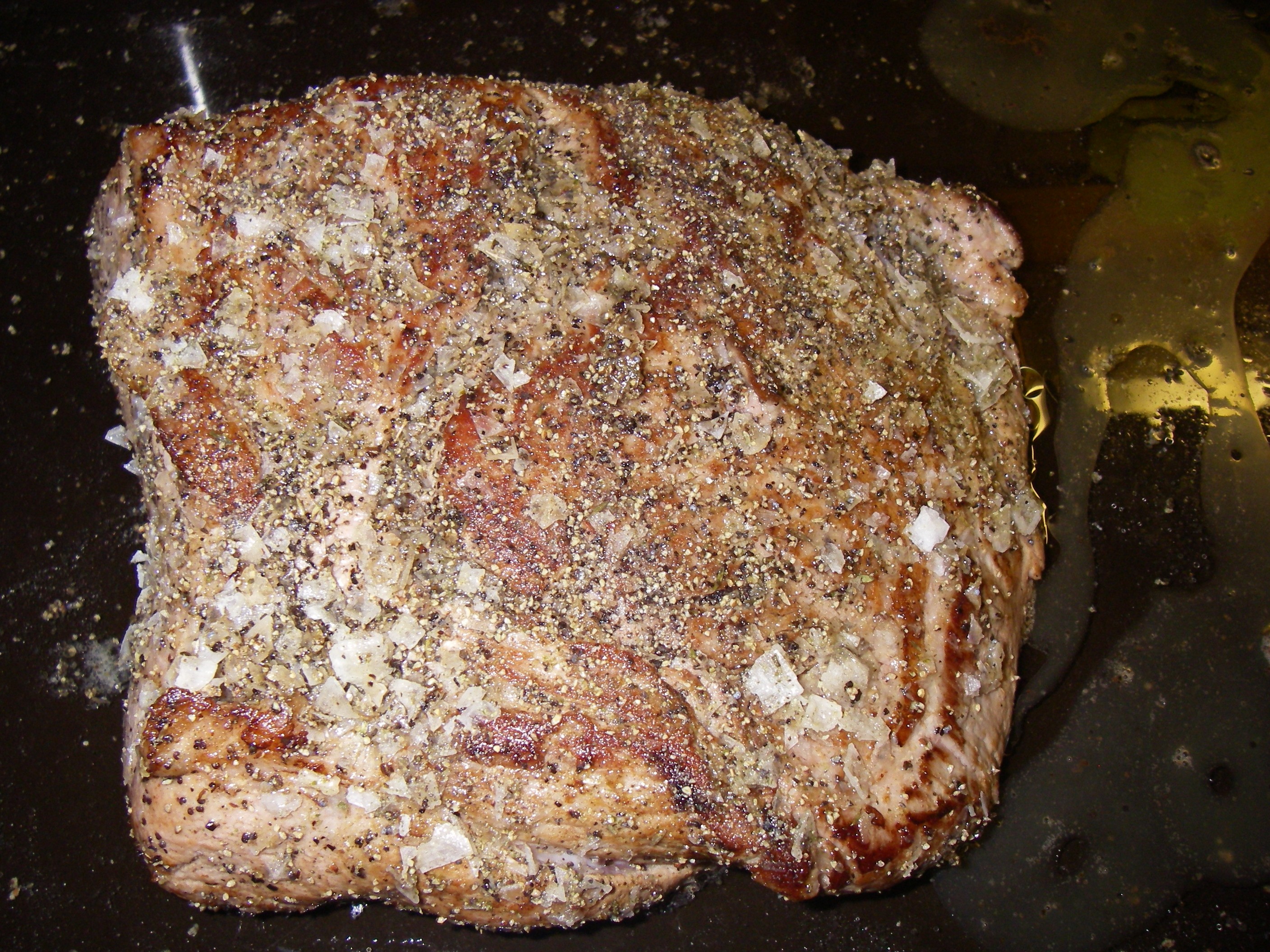 Alltid lär man sig något nytt, för aldrig har jag vetat att man kan laga mat och sova samtidigt och då talar jag inte om att gå i sömnen eller så. Jag var ute och åt lunch med en ”gammal” kollega och vi åt nattbakad fläskkarré, mycket gott kan jag tillägga. Var naturligtvis tvungen att lista ut hur man tillagar en sådan rätt. För det första köper man en bit fläskkarré det blev för min del en bit på 1,4 kg, den gneds in med matolja och följande kryddor. Flingsalt 1,5 msk, grovmalen svartpeppar 1,5 tsk, torkad oregano och timjan 1 tsk vardera samt 1 tsk salladskrydda.