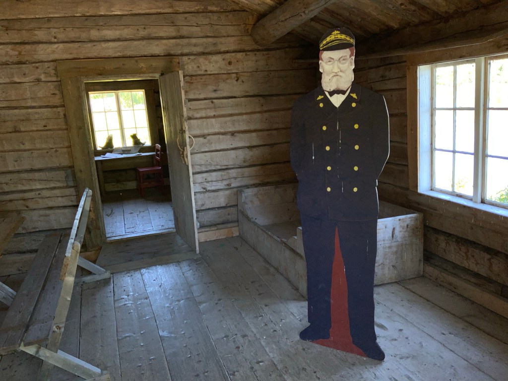 När man kommer över bron och går in i mot bebyggelsen har man den gamla kyrkogården till höger och det första huset på vänster sida. Det är länsmansstugan.