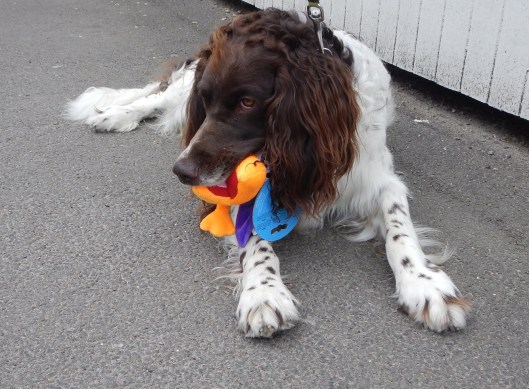 Visst blev det något köpt, Bachus valde en ank/pappegoja som pep lite. Han bar den stolt i munnen genom sin promenad i staden. Kan säga att det var många som drog på munnen eller skrattade när de såg det.