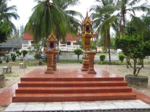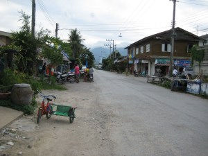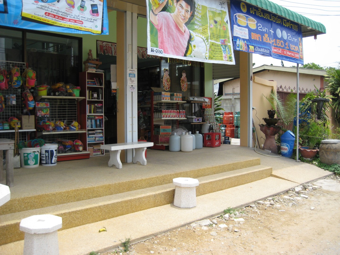 Det här är byns största shoppinggata, ser lite magert ut men faktum är att man kan finna det mesta. Vi handlar gärna på Pops de har ett bra sortiment och här kan man även köpa kontantkort. Dessutom kör de gärna hem varorna då det kan vara tungt att dra en massa vatten på en motorcykel. Länge upp till höger finns en annan bra affär som heter Si Shop bredvid den finns det även två ATM automater.