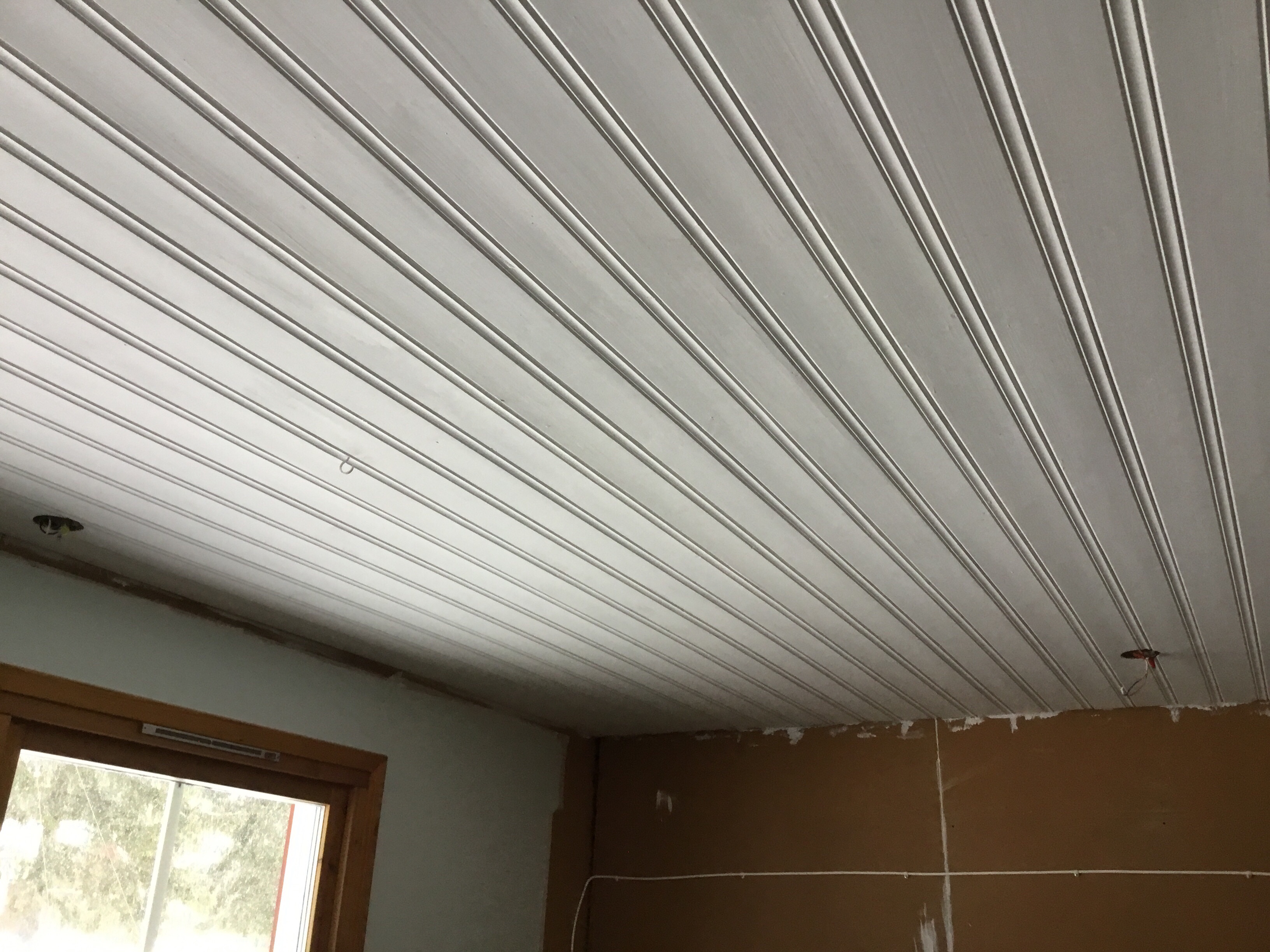 Vi har ju trätak i hela huset och jag har alltid tyckt om dem, de ger en varm och inbonad känsla. Men så fick jag för mig att vi kanske skulle måla om ett tak till vitt. Men icke, det är svårt och blir inte bra sa Rolf som annars är väldigt pigg på att anta utmaningar. Det var för några år sedan. Men nu slumpade det sig så att när snickaren var här förra veckan stannade han till precis innan han skulle gå och sa; om det vore jag skulle jag måla taket vitt.