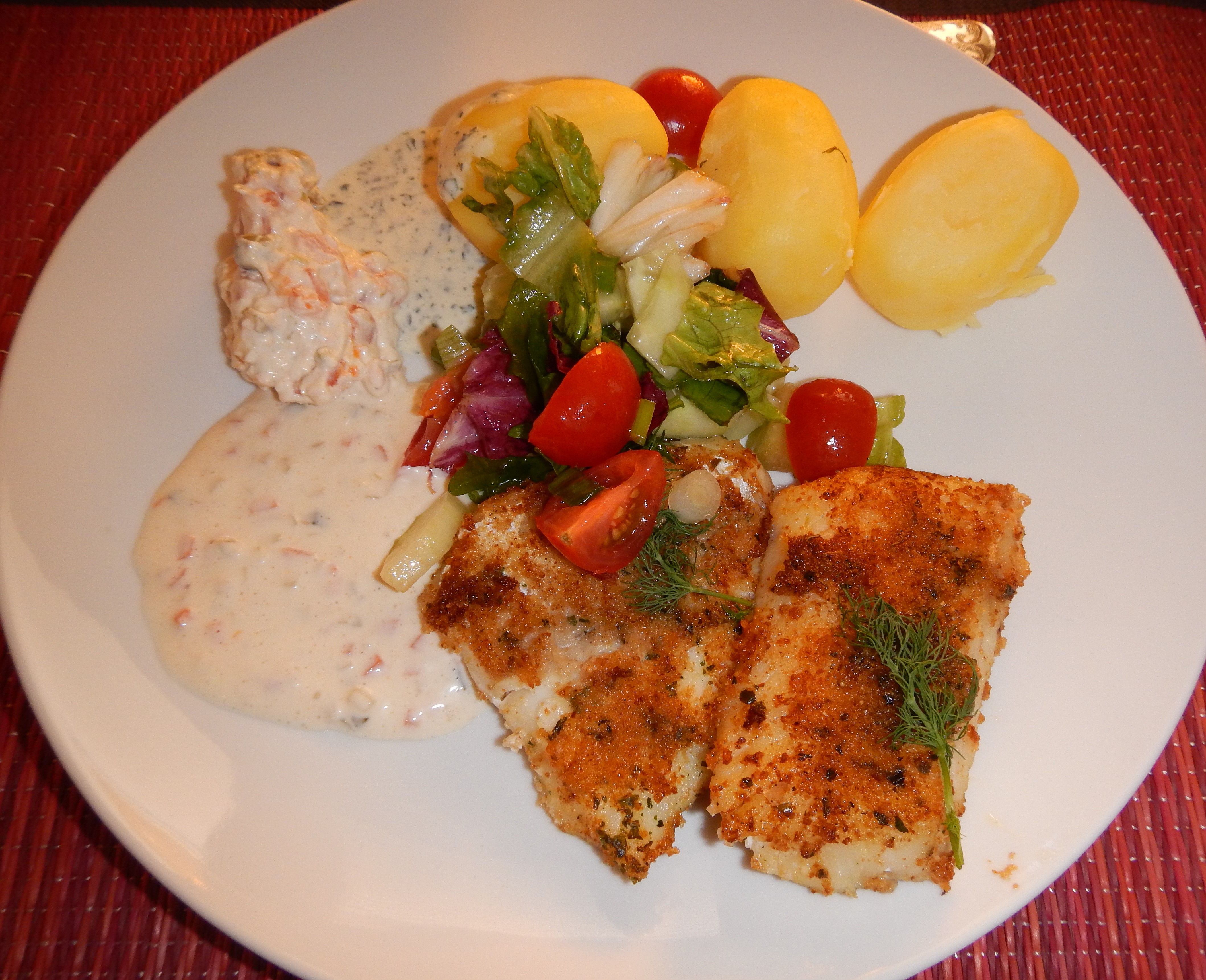 Varför skrev jag inte blogg igår, jo det ska jag tala om vi åkte ända till Västerås och där blev vi bjudna på middag. En förrätt som bestod av toast och gräddig regnbåge, huvudrätten ser ni nedan. Nyfångad stekt mälargös, nypotatis, sallad och tre olika såser. Kan tala om att det smakade utmärkt i synnerhet som det efterföljdes av hemgjord glass, jordgubbar och smarrig chokladsås. Blev ni hungriga?