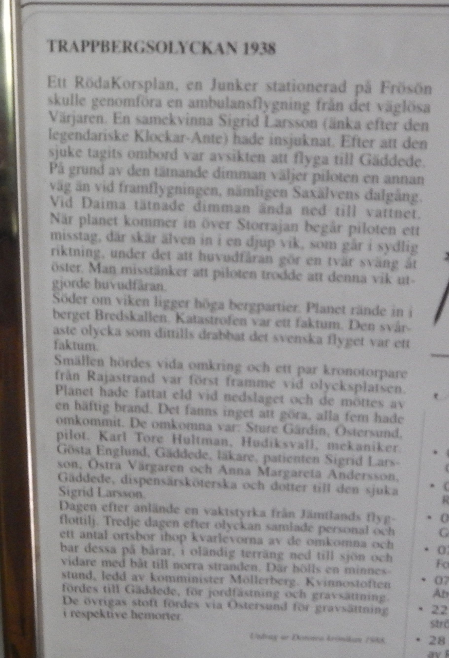 I planet fanns fem personer och alla omkom i det som senare beskrevs som Trappbergsolyckan 1938. Detta var då en av de största flygolyckorna i Sverige och äldre personer i trakterna där minns det än i alla fall de muntliga beskrivningarna de fått. På bilden nedan ses planet.