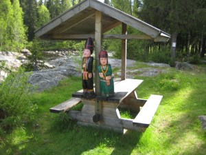 Vi var i kyrkan för att vara med på ett barndop och då användes naturligtvis dopfunten. Den är fyrkantig och varje sida har lite relief i övrigt målad med fyra bilder en på varje sida. Utsmyckningen är gjord av Torborg Lindberg från Storbäck. En kvinna berömd för sina fantastiska sameskulpturer, de känns igen på hennes signatur TL. Nedan syns den annorlunda dopfunten.