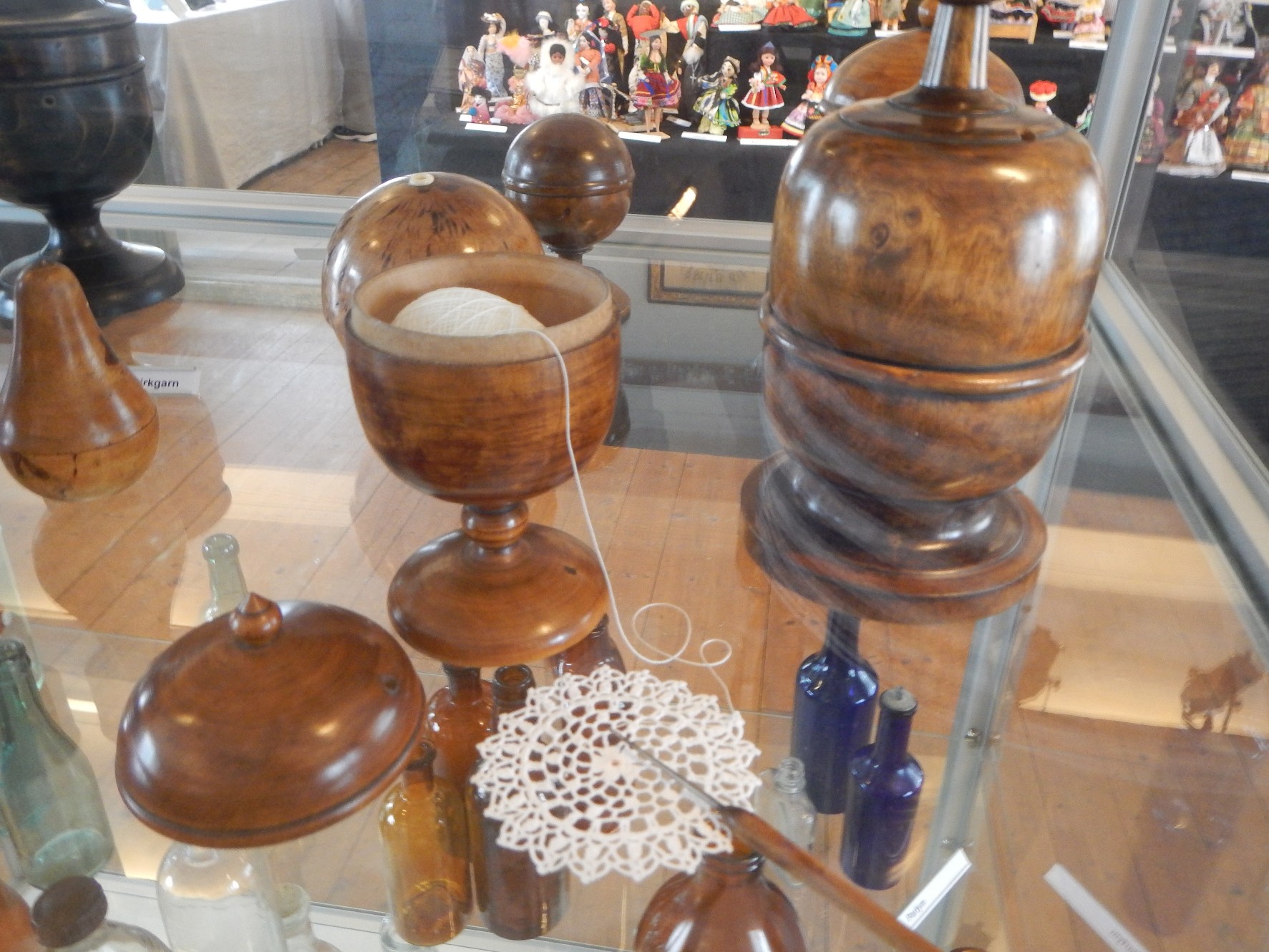 De här snidade träaskarna önskar jag att jag hade haft en i dag, Det är ett slags etui för garn, perfekt när man virkar för då snor sig inte garnet.