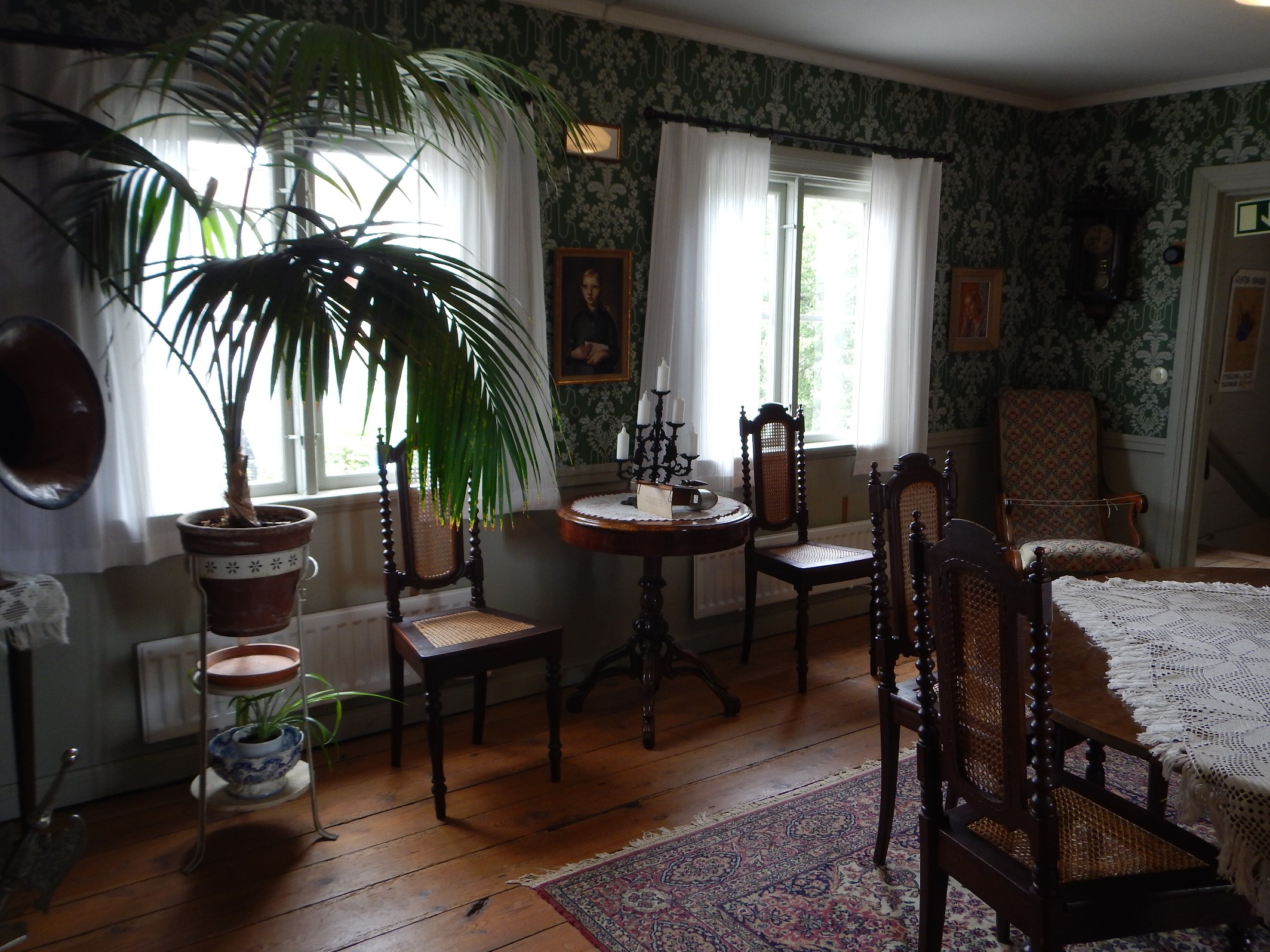 Matsalen från ett typiskt överklasshem såg väldigt inbjudande ut. Jag gillade det skarpt. Väggarna är klädda med en tapet i gråvitt mönster mot grön botten. Det är ett nytryck från AB Doro Hagaström, efter den ursprungliga tapeten från 1810 signerad CA Werner i Karlskrona.