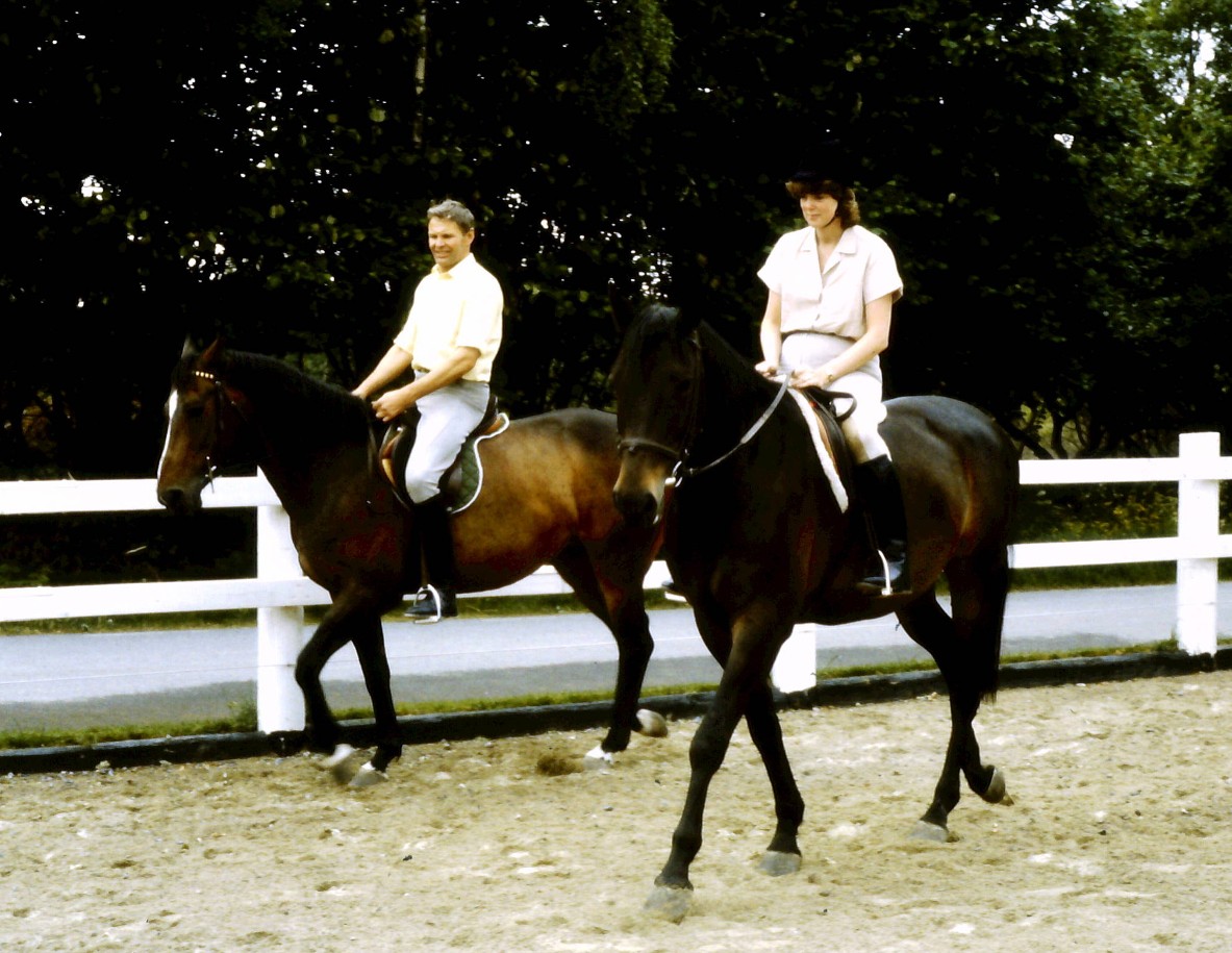 Vårt äldsta barnbarn berättade för mig att hon igår varit med en kompis till hennes stall men hon berättade också att hon inte gillade hästar. Barnbarnet alltså inte kompisen. Det har hon säkert efter farmor, kom att tänka på en gång för längesedan (100år) när Rolf och jag besökte goda vänner i Skåne. Båda var väldigt duktiga ryttare och hade fins ridhästar, så vid ett besök skulle vi få prova på att ta en ridtur. Eftersom jag dels var lite rädd för hästar och dels tyckte att det verkade som att man satt väldigt högt upp, var jag lite nervös. Jag hade i alla fall tillgång till en skicklig instruktör och måste väl säga att det var både roligt och spännande.