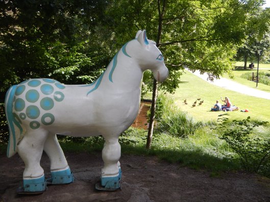 Helt plötsligt gick vi på en stor häst, lite nyfiken på varför den stod där blev jag ju. Så här står det på informationen om hästen på internet. ”Man sa att Bäckahästen var ett lömskt rovdjur som lurade barnen att rida på dess rygg för att sedan dra ned dem i vattnet. Barnen tycker att den är så fin att de vill rida på den. Ryggen blev bara längre ju fler barn som red på den. Om man vill hindra en bäckahäst att dränka barnen skall man kasta en bit stål mellan hästen och vattnet. Då kan hästen inte gå den vägen, och dess makt är bruten”.