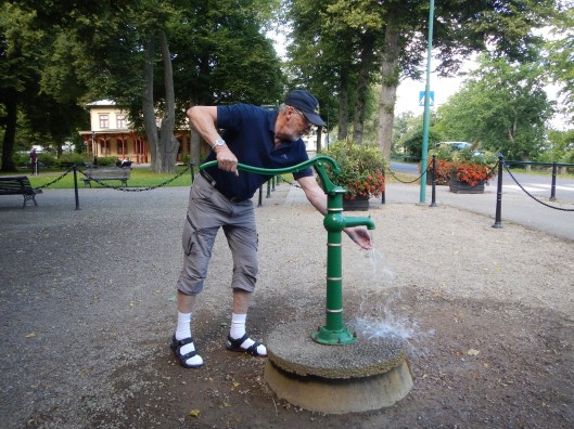 Idag fick vi hålla tillgodo med en betydligt enklare pump men Rolf passade ändå på att ta en klunk av det ”helande” vattnet.