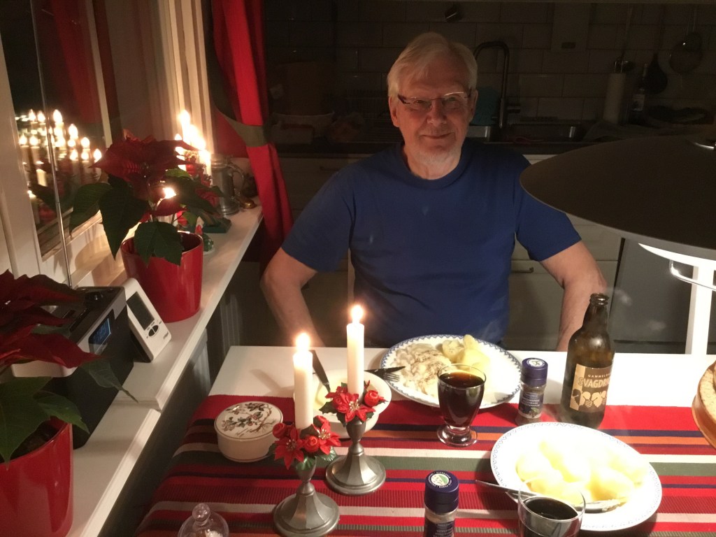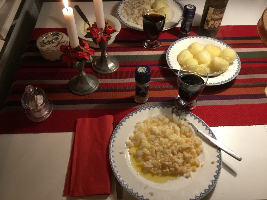 Själva firade vi den som vanligt med den traditionella lutfisken. Det är en fisk ofta Långa eller Sej men förr om åren kan jag tänka mig att det användes många andra sorters fisk för att få till just lutfisk. Den äldsta notering om denna rätt är från år 1464 och det var biskop Brask som åt den tillsammans med mandel, russin och ärtor. Fisken spänns upp och hängs på linor för torkning för att lätt kunna förvaras. När de ska användas lägger man den i blöt. Jag fick lära mig att det skulle ske på annandagen, detta kalla vatten skulle bytas en gång om dagen i sex dagar. Jag minns att jag hjälpte min mormor att göra detta i källarn och fy vad man frös om fingrarna. Efter dessa dagar skall det tillsättas lut och sedan ytterligare sex dagar då det ska bytas vatten. En omständlig procedur med andra ord.