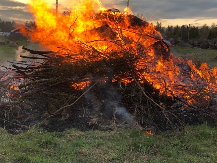 Det hör till att man ska stå och huttra lite vid en Majbrasa och även där kan det vara sång o tal. I år hade vi tur eftersom vi i vår karantän inte trodde vi skulle få se någon brasa. Men det fick vi, en familj efter vägen hade samlat ihop en bra brasa och den tändes på kvällningen. Vi var omkring tjugo vuxna som stod runt och tittade. Det var nog 5-6 meter emellan oss. Så vi uppfyllde kravet 2 meter med råge.